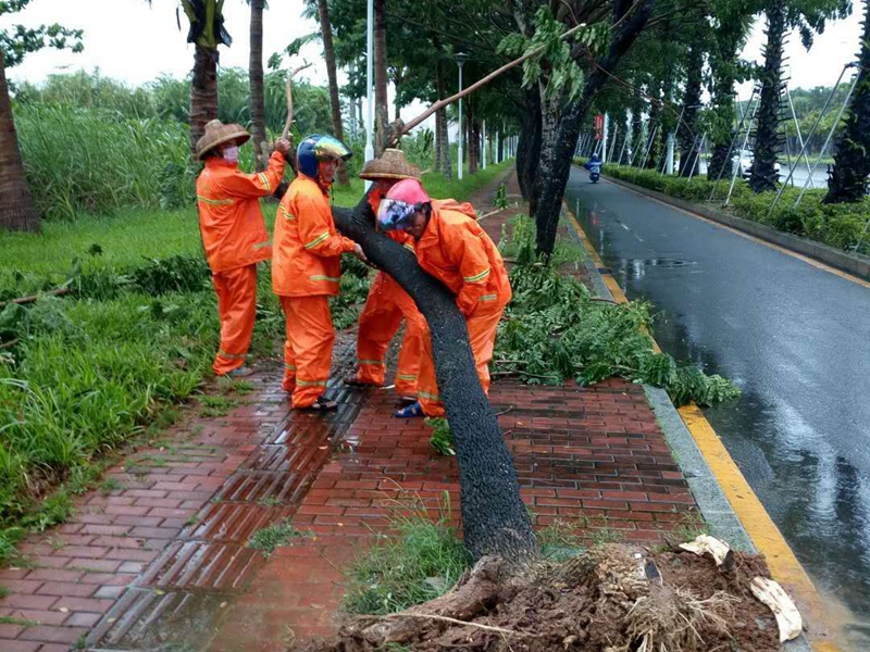 今年第9號(hào)臺(tái)風(fēng)“山神”的中心于今天凌晨4點(diǎn)50分前后,在海南萬寧市萬城鎮(zhèn)沿海登陸。受其影響,今天三亞、陵水有大到暴雨,將三亞、陵水街頭不少樹木刮倒,到處是殘枝敗葉,一片狼藉。臺(tái)風(fēng)中,為了確保市容環(huán)境的整潔、干凈,集團(tuán)公司安排環(huán)衛(wèi)工人全員上崗,加緊清理街道路面,使城市迅速恢復(fù)潔凈。