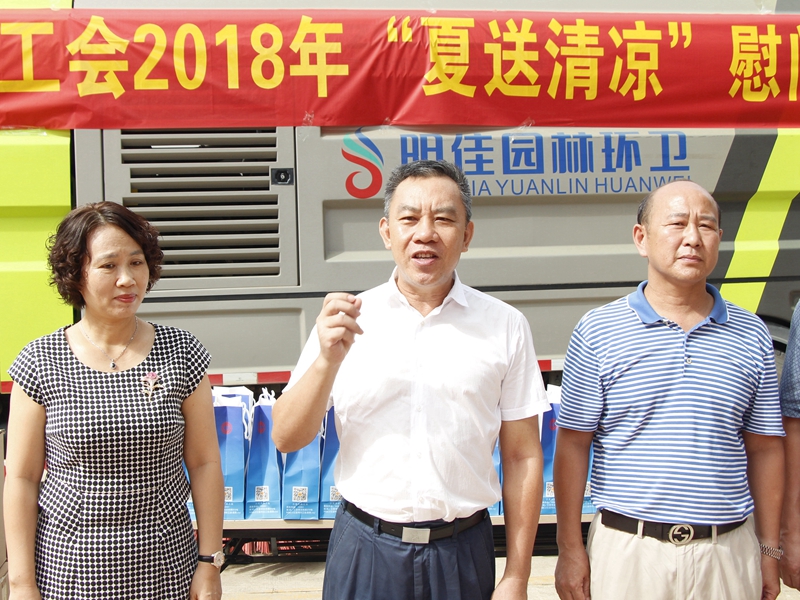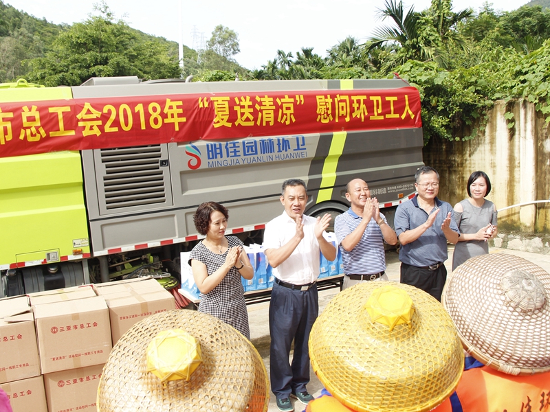 “你們辛苦了!感謝你們?yōu)槿齺喪忻、游客?chuàng)造了一個(gè)干凈整潔的人居環(huán)境,為三亞市“創(chuàng)文鞏衛(wèi)”工作作出的突出貢獻(xiàn)”。張羽飛代表三亞市總工會(huì)向集團(tuán)公司全體職工致以親切的慰問。他指出,環(huán)衛(wèi)工人頭頂列日,揮灑汗水,以“寧愿一人臟,換來(lái)萬(wàn)家凈”的精神,為靚扮鹿城、建設(shè)國(guó)際化熱帶濱海旅游精品城市提供衛(wèi)生保障。他勉勵(lì)大家繼續(xù)發(fā)揚(yáng)三亞環(huán)衛(wèi)人的精神,勇當(dāng)尖兵的決心,提高環(huán)衛(wèi)作業(yè)質(zhì)量,在三亞市社會(huì)文明大行動(dòng)和新一輪“創(chuàng)文鞏衛(wèi)”工作中作出新的更大貢獻(xiàn)。