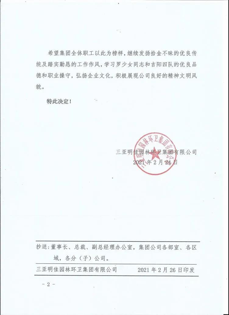 為表彰羅少女同志拾金不昧的精神,三亞明佳園林環(huán)衛(wèi)集團(tuán)有限公司于2021年2月25日 15:30時(shí),在集團(tuán)公司三樓會(huì)議室召開拾金不昧表彰大會(huì)。明佳集團(tuán)黨支部書記、董事長(zhǎng)陳明,黨支部副書記、總裁陳云及20名員工代表參加會(huì)議。
