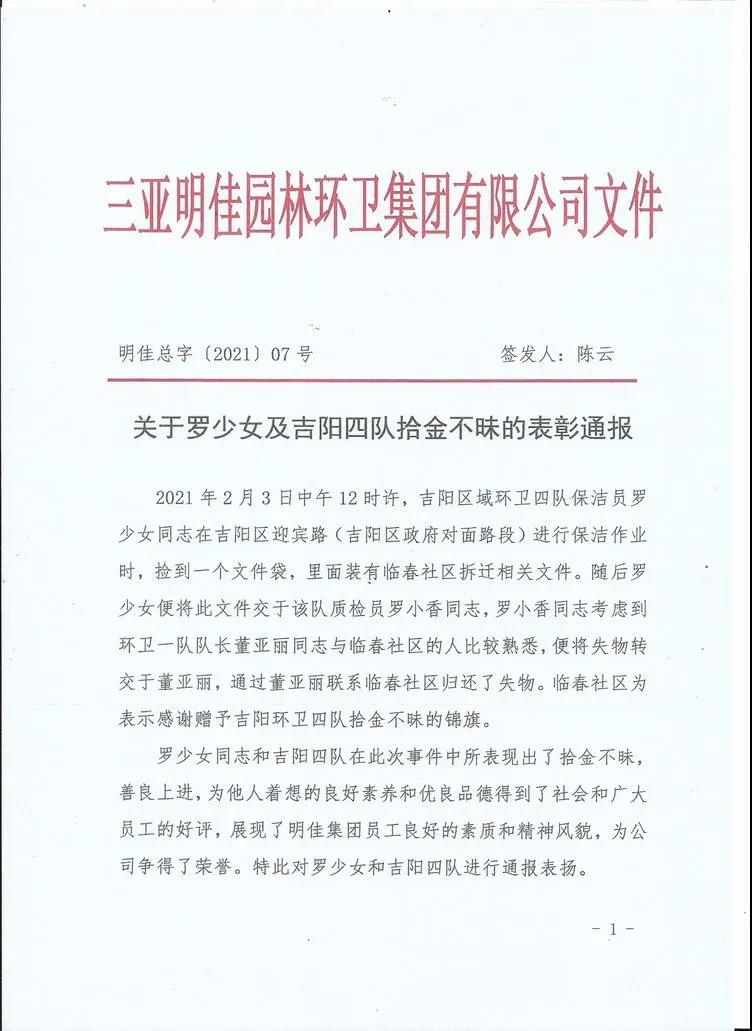 會(huì)上,明佳集團(tuán)黨支部書記、董事長(zhǎng)陳明宣讀了《關(guān)于羅少女及吉陽四隊(duì)拾金不昧的表彰通報(bào)》