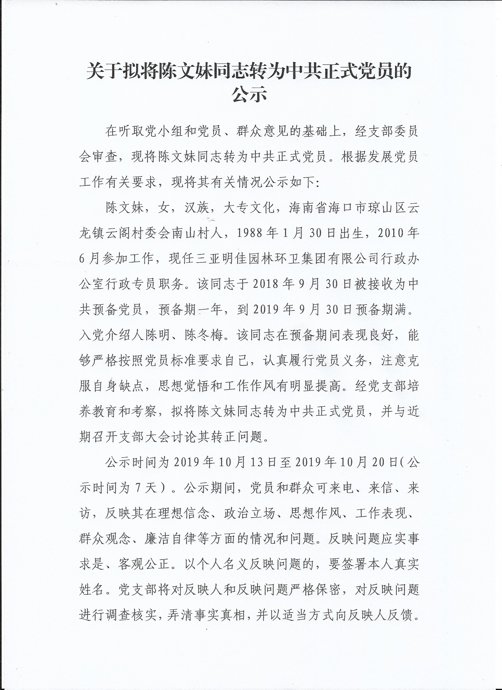 關于擬將陳文妹同志轉為中共正式黨員的公示